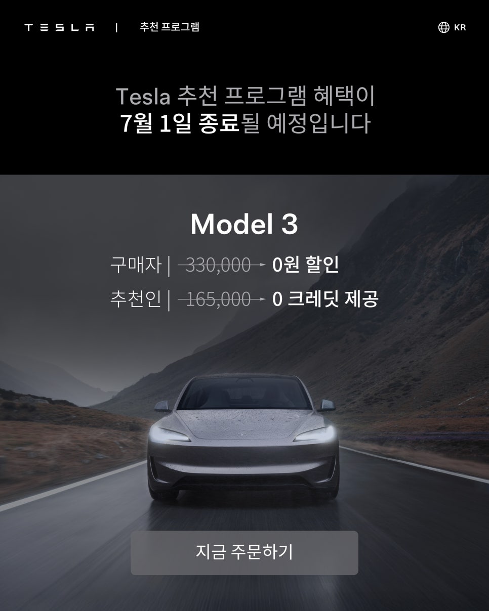 안녕 하세요. 오랜만에 테슬라 관련 포스팅을 하게 되는거 같습니다 그런데 테슬라 구매를 망설이셨던 분들께 아주 중요한 소식을 전해드립니다. 현재 진행 중인 테슬라 추천 프로그램이 오는 7월 1일부로 전면 종료됩니다. 아직 기회가 남아 있으니, 프로그램 혜택을 놓치지 마시고 서둘러 주세요!